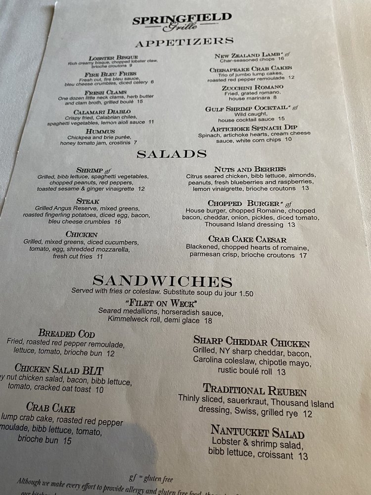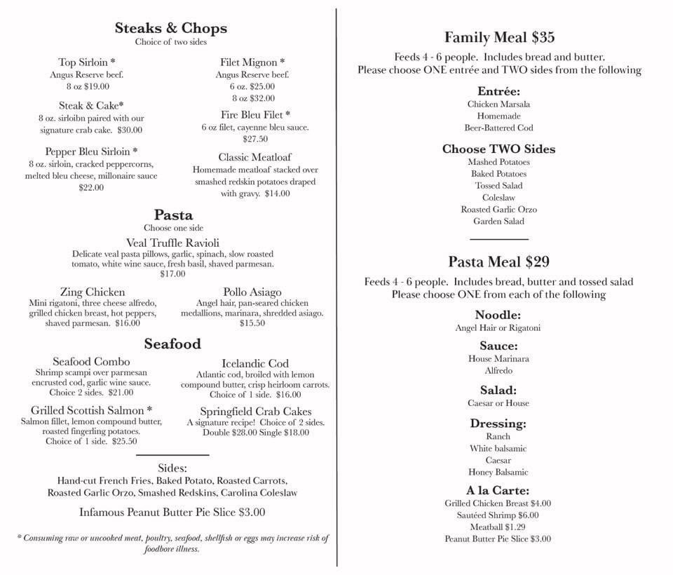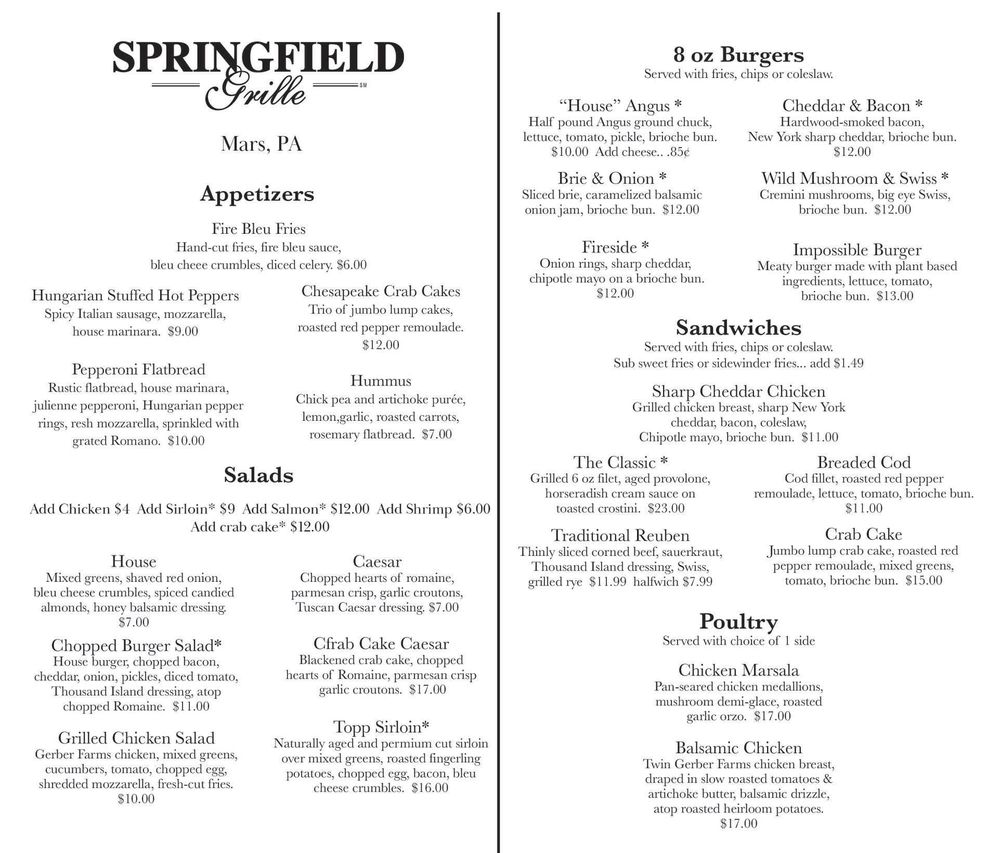 Introducing the menu at Springfield Grille, a beloved steakhouse in Mars, PA, offering a fusion of New American and seafood dishes. With a wide array of options for vegetarians, this restaurant caters to various dietary preferences. The ambiance is described as romantic and cozy, making it perfect for a date night or family dinner. Customers rave about the artichoke dip, crab cakes, and specialty dishes like the fire bleu filet medallions and Italiano steak. The bar side offers a more relaxed atmosphere, while the dining area provides a more intimate setting. Enjoy happy hour specials, a full bar, and delicious appetizers like zucchini fries. Don't miss out on the house-made peanut butter pie! Experience top-notch service, great prices, and mouth-watering meals at Springfield Grille.